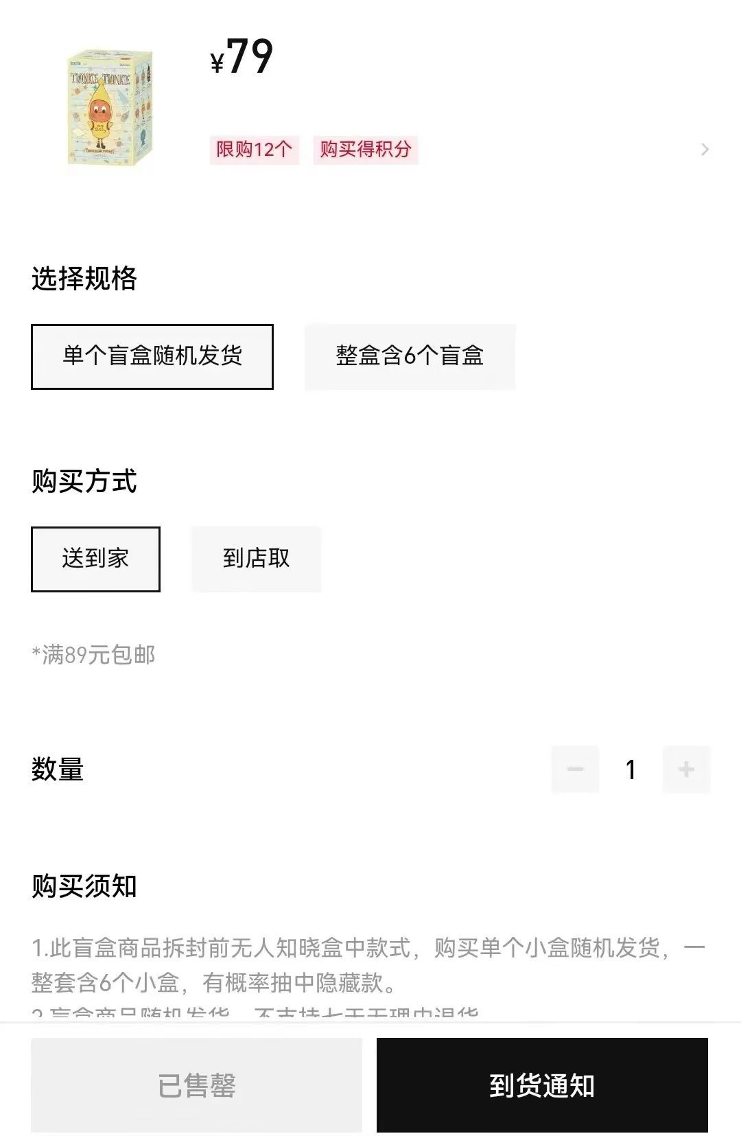 记者21:59进入泡泡玛特小程序。等开售倒计时结束,立即点击购买按键,页面显示“太火爆了,请稍后重试”,不断刷新至22:01,终于可以进入商品选择页面时,显示商品已售罄。