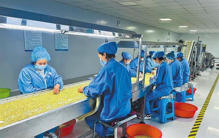 吉林省梅河口市浩成食品有限公司生产车间内,工人们在分拣脱壳后的松子籽粒。经济日报记者 马洪超 摄