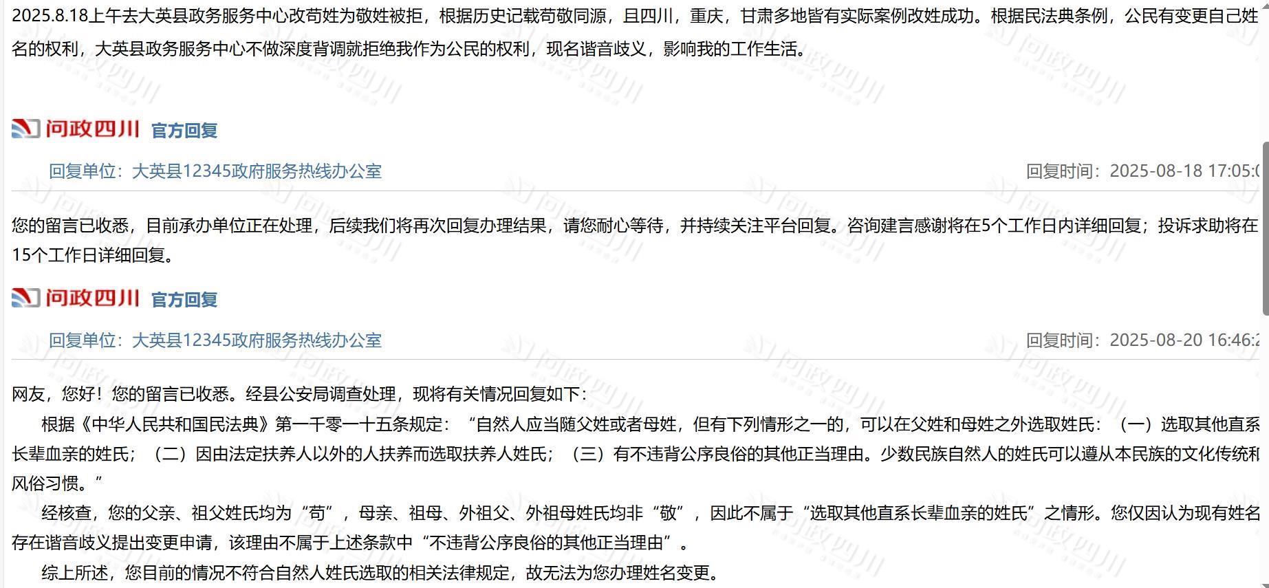 8月18日,四川遂宁大英县一位苟姓市民在问政四川投诉称,由于“现名谐音歧义,影响工作生活”丹东股票配资,她希望将苟姓改为敬姓,但是未能成功。